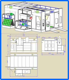 TARİFİ Düşük basınç altında çalışan hava kanallı boya tabancası ile aracın boyandığı ve kurutulduğu Boyama ve Kurutma kabinidir. Hava tavan filtreleme sistemi ile tesis dışından alınır. Boya partikülleri paint stop filtrelerle tutularak havadan ayrıştırılır. Kabin mazot brülörü ve fan - motor üniteleri ile donatılmıştır. Kabin girişi önünde giriş rampası ile birlikte, metal şase veya bir kazı çalışması hava sirkülasyonu için ünitelere bir kanal bağlantısı yapılarak tesis zemini üzerine monte edilebilir.